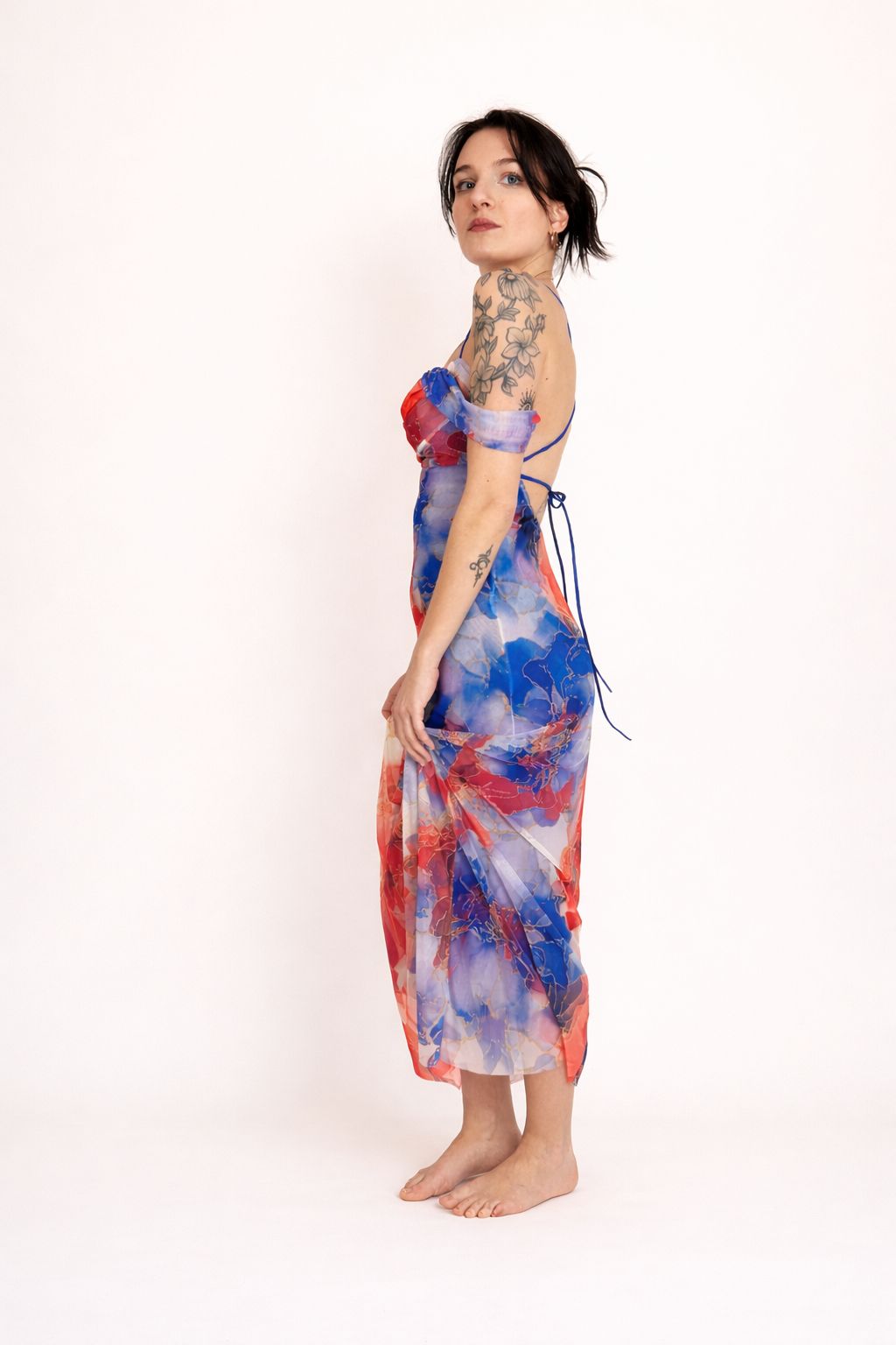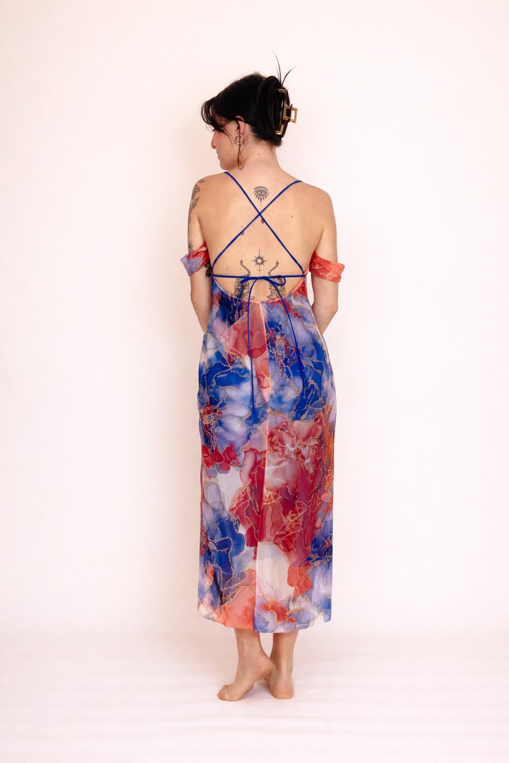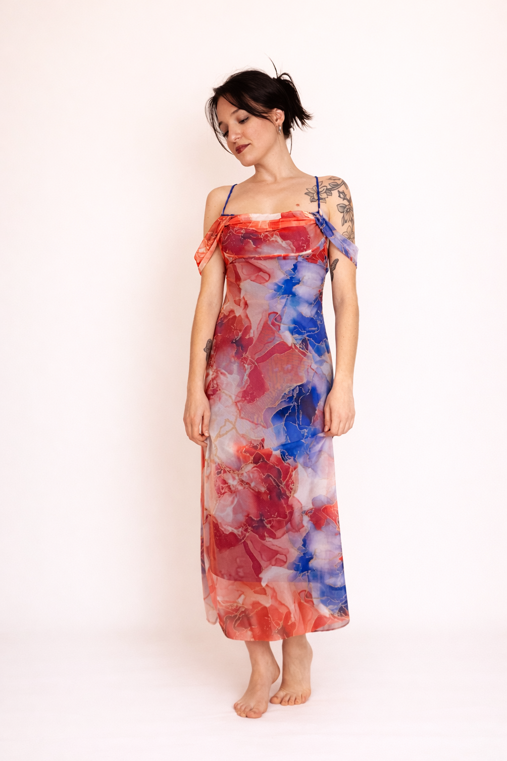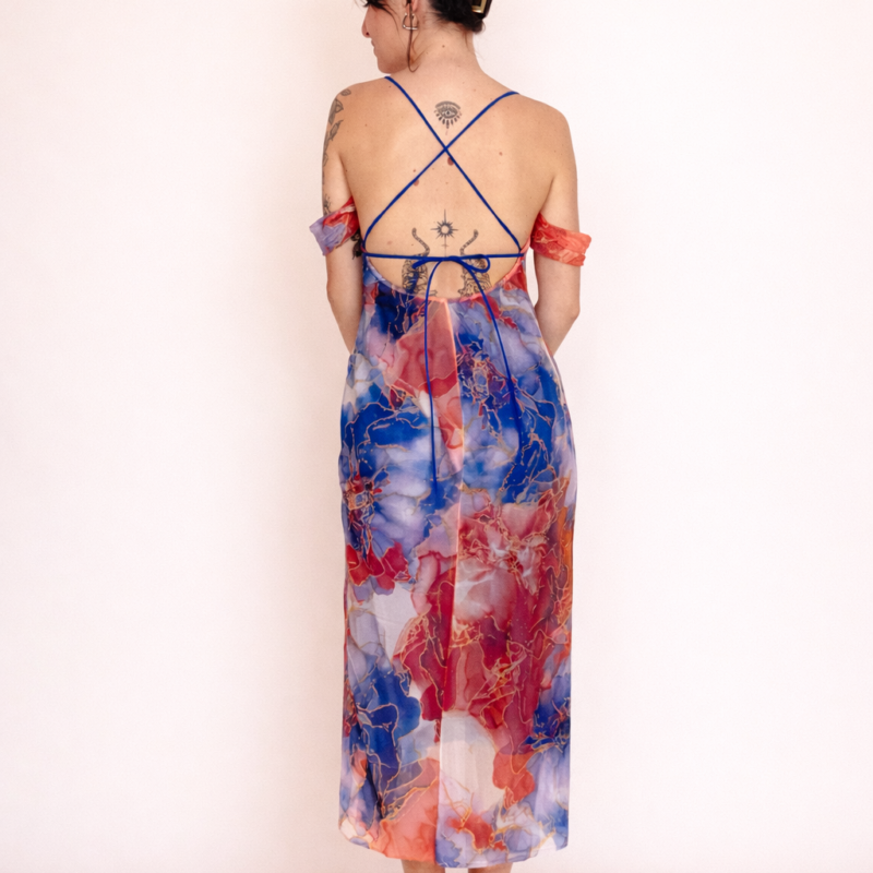 Abito lungo fino le caviglie, colorato sui toni del rosso e del blu, foderato con sottoveste blu. Leggero ed etereo, con scollatura sul retro. Vivi il tuo sogno da dea.