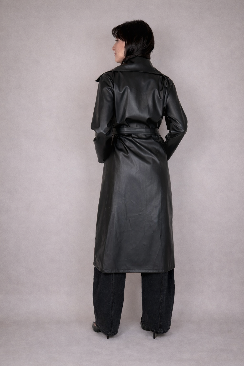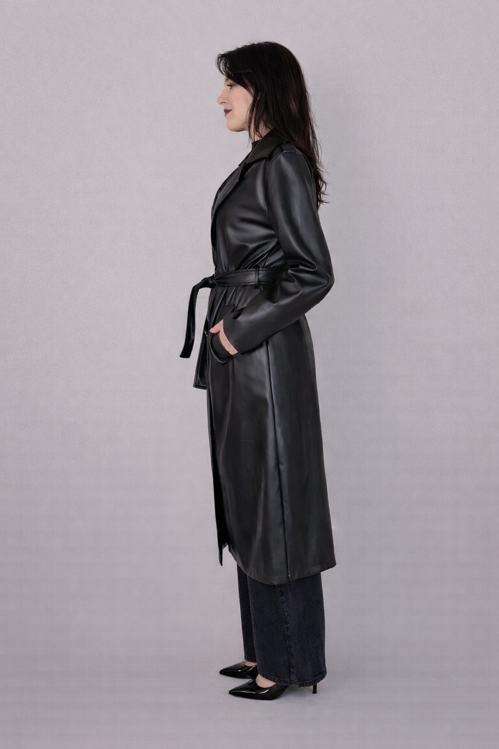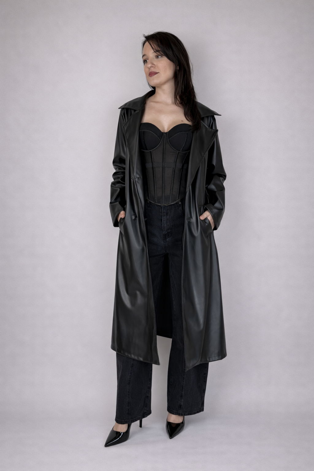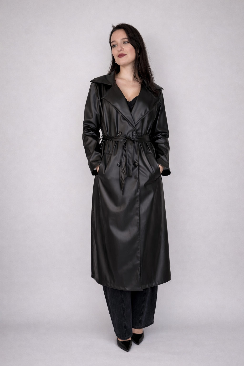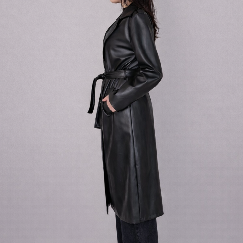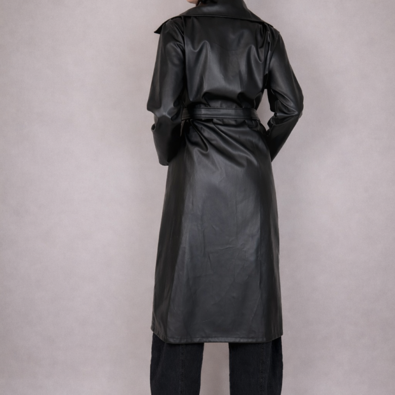Trench nero lungo in ecopelle.
