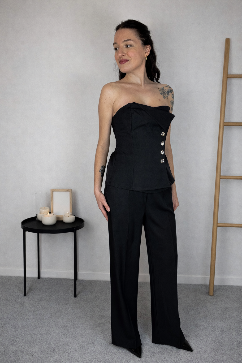 Completo elegante con top e pantalone elasticizzati sul retro.